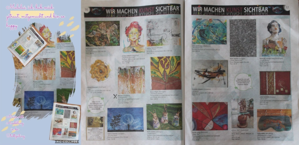 news Hier stehen Neuigkeiten und ich zeige Bilder von meinen bisherigen Aktivitäten Ich durfte im Schaufenster der Brillenschau P.Schöbel in Steppach Bilder ausstellen – hier siehst du mein Bild „Sommerchaos“. Dieses Bild zeigt meinen Stand während der„Gartentage“ auf Gut Mergenthau. … und dies war die erste Erwähnung meiner Kunst in der Stadtzeitung ……….. unter : „wir machen Kunst sichtbar“ … und in der Online-Ausstellung von „my heimat KULTUR“