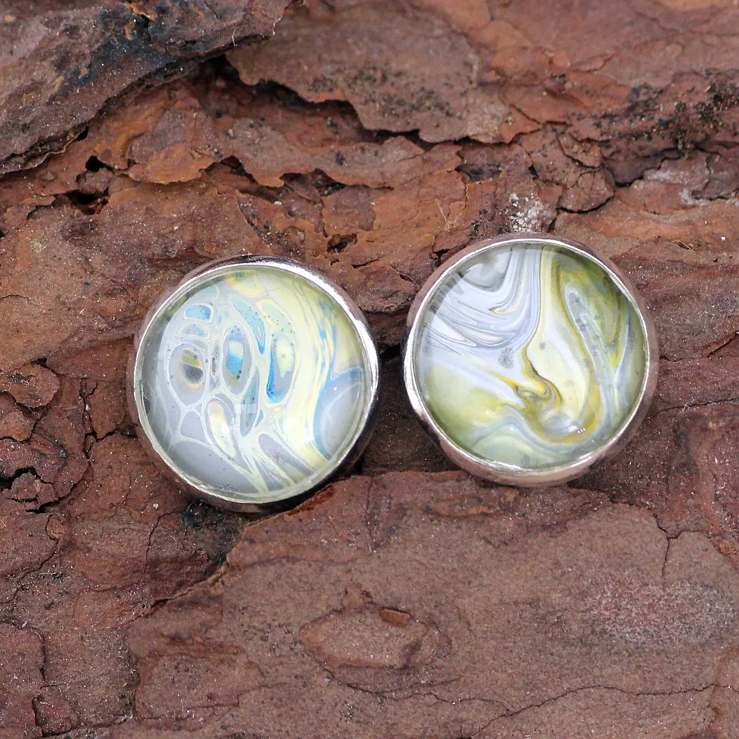 Ohrringe mit Acryl-Pouring ... und wieder kannst du in dem Farbenspiel etwas suchen oder es einfach nur genießen 341o 348o farblich passende Anhänger Ø 25mm farblich passende Ringe farblich passende Anhänger Ø 12mm solltest Du Interesse an den Ohrringen haben, gerne über Kontakt eine Nachricht senden